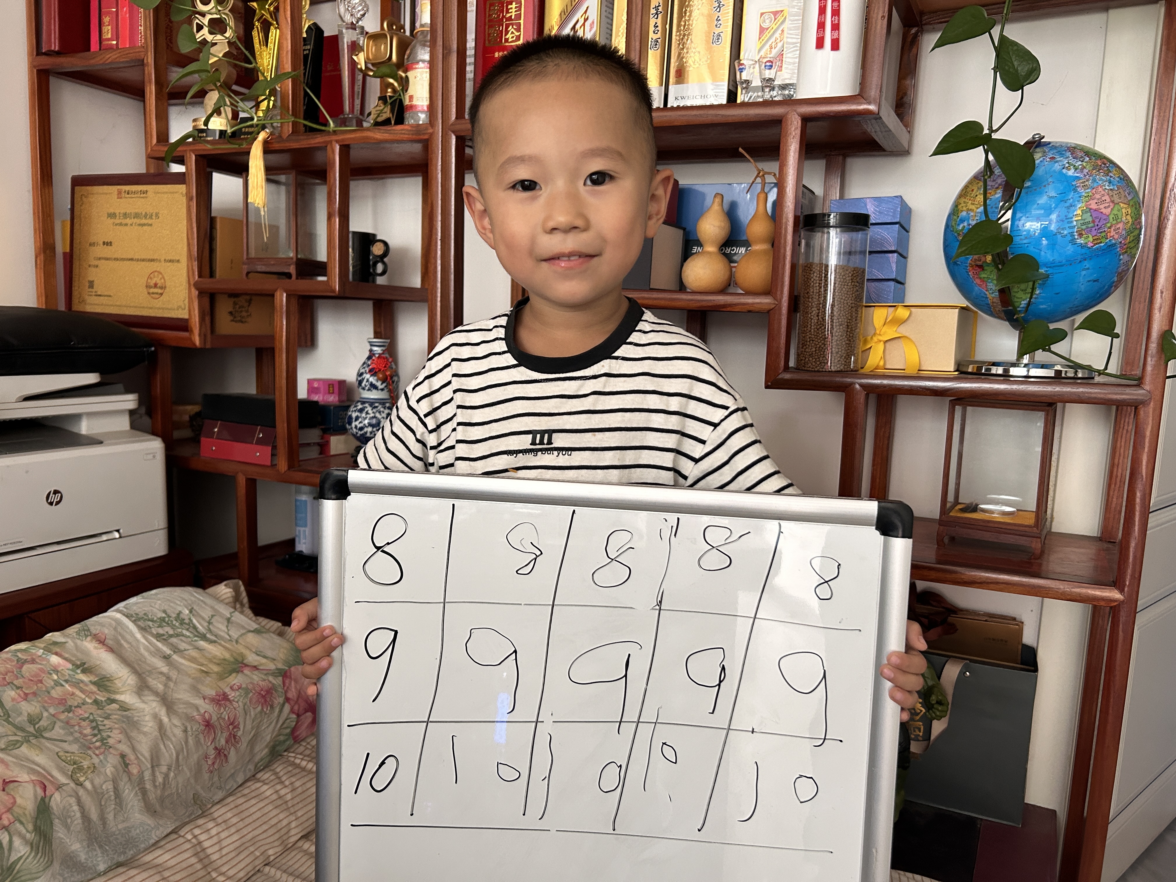博珉,一个对世界充满好奇的4岁小男孩,今天迎来了他人生中的一个重要时刻——第一次写数字。阳光透过窗户,洒在他的小书桌上,仿佛连太阳都在为他加油鼓气。